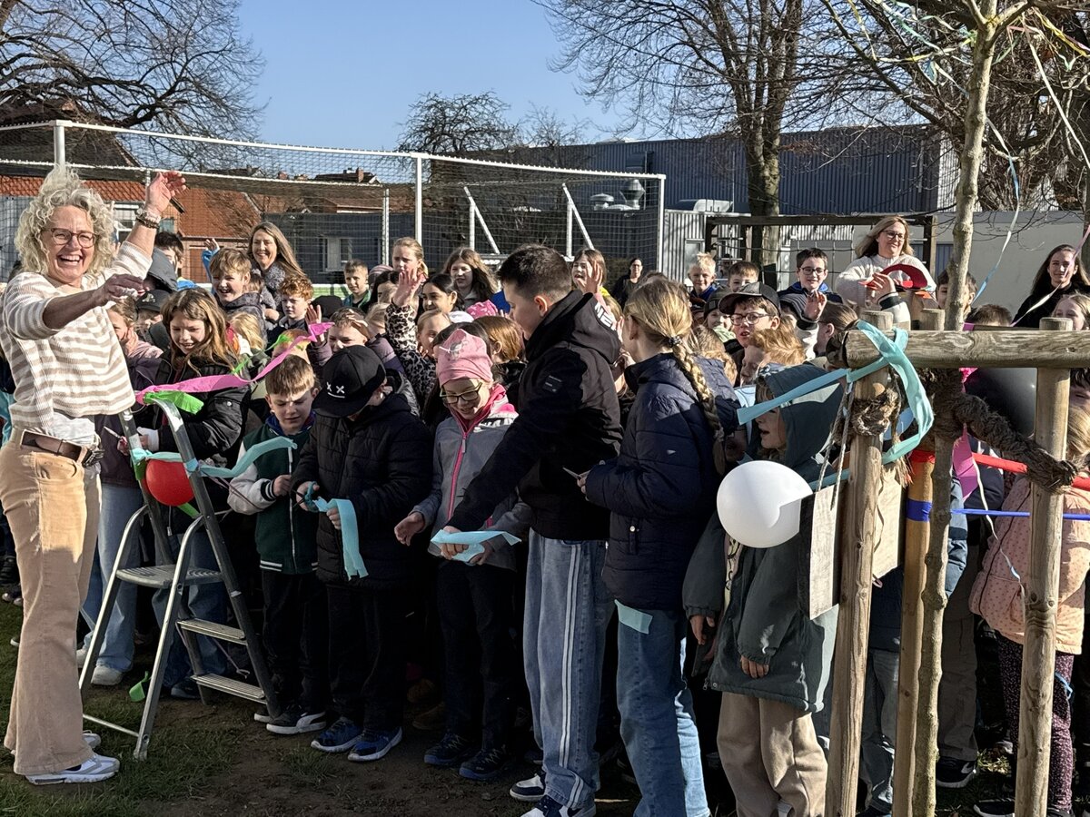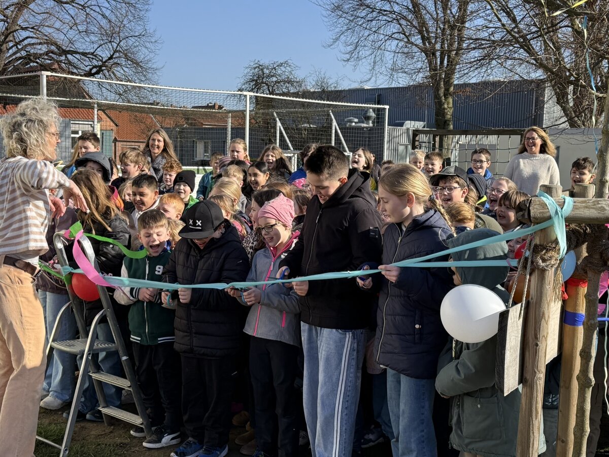 Danach versammelten wir uns auf der Grünfläche davor und unsere KlassensprecherInnen durften nach ein paar feierlichen Worten durch Frau Süß das symbolische, bunte Absperrband zerschneiden und haben damit das Startzeichen zum Erobern der neuen Spielgeräte gegeben.