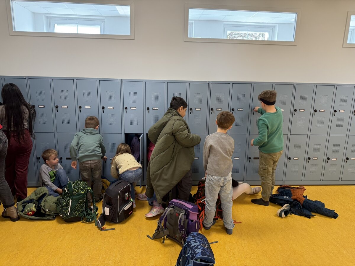 Ein ganz besonderes Highlight der Kinder war am Donnerstag die erste Benutzung der Spinde. Wie cool, nun können alle Jacken, Schuhe und das Sportzeug platzsparend und feuerfest verstaut werden und jeder hat seinen eigenen Schrank.